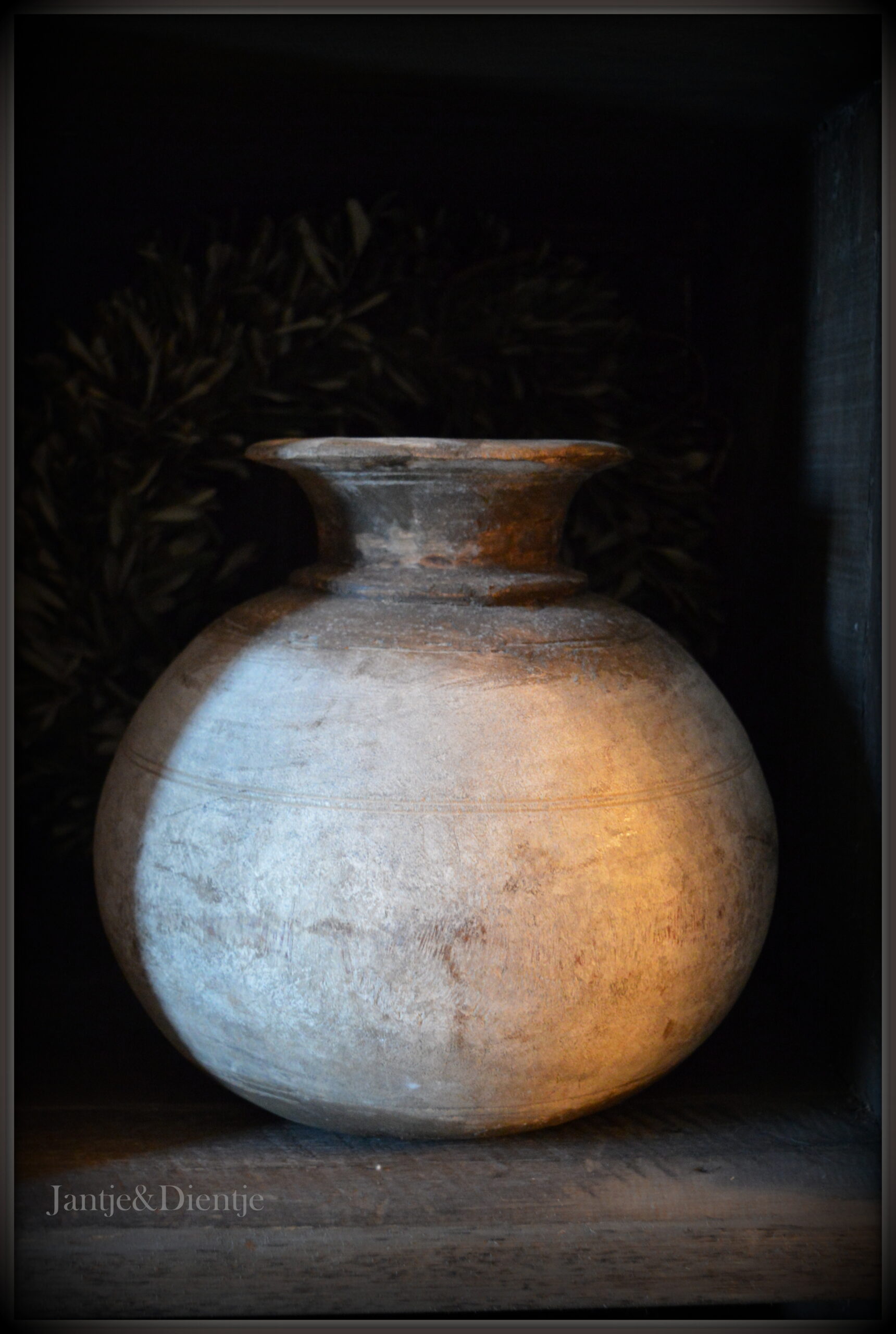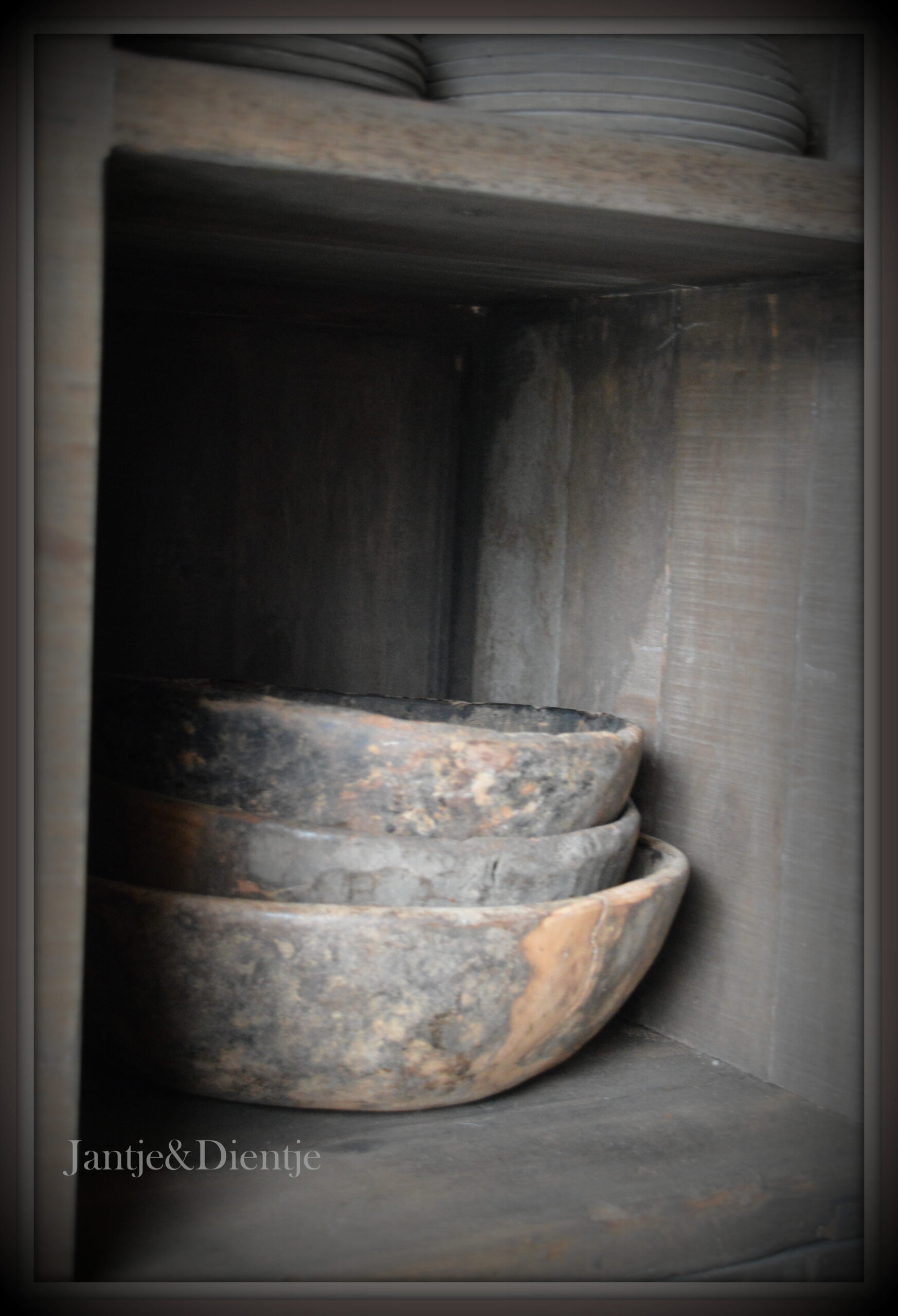De kast is hier gedecoreerd met diverse aardewerk en houten voorwerpen, wat de rustieke charme nog verder benadrukt.