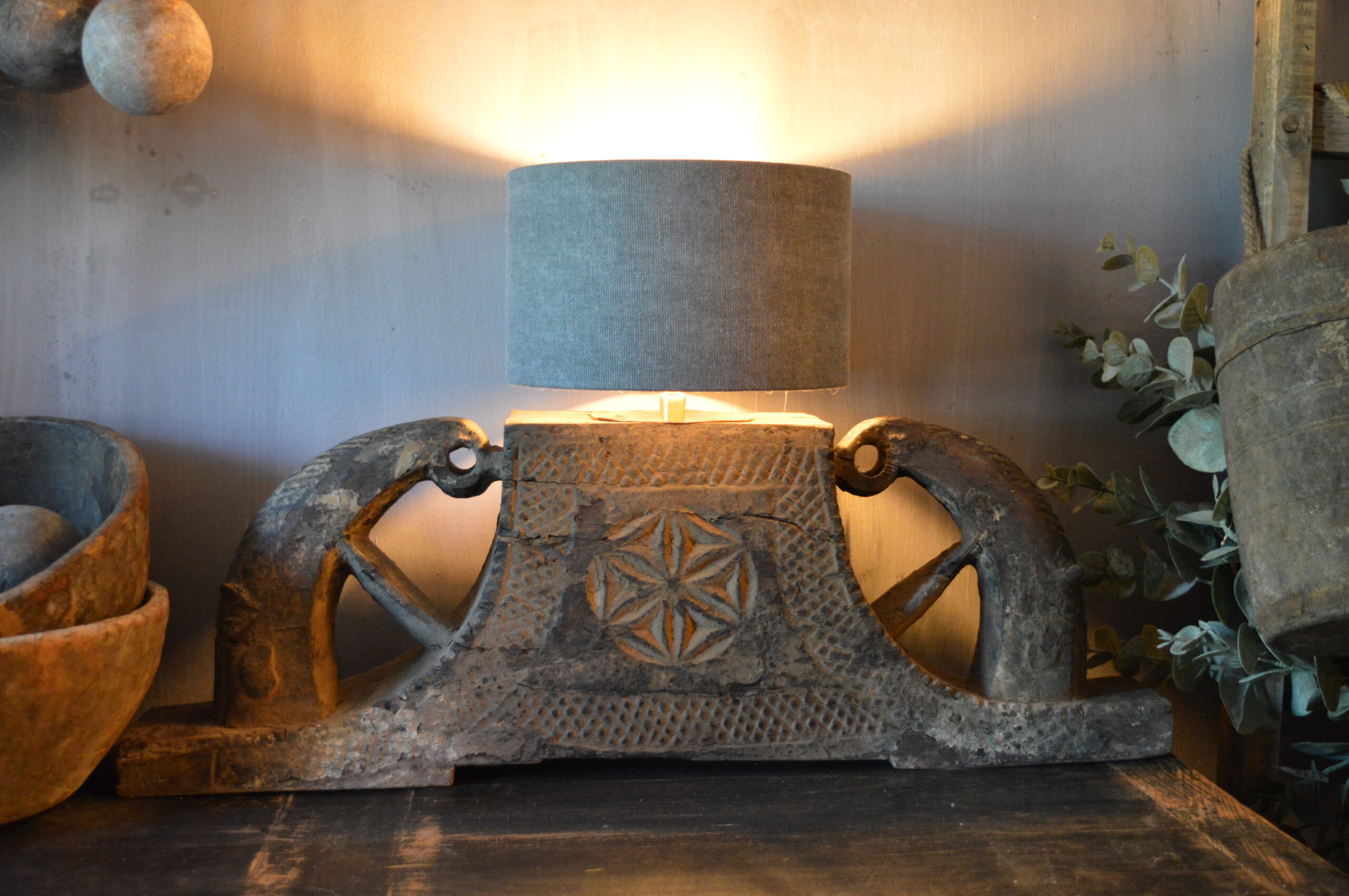 Mooie sfeervolle lamp van authentieke houten poer. Compleet met linnen kap.