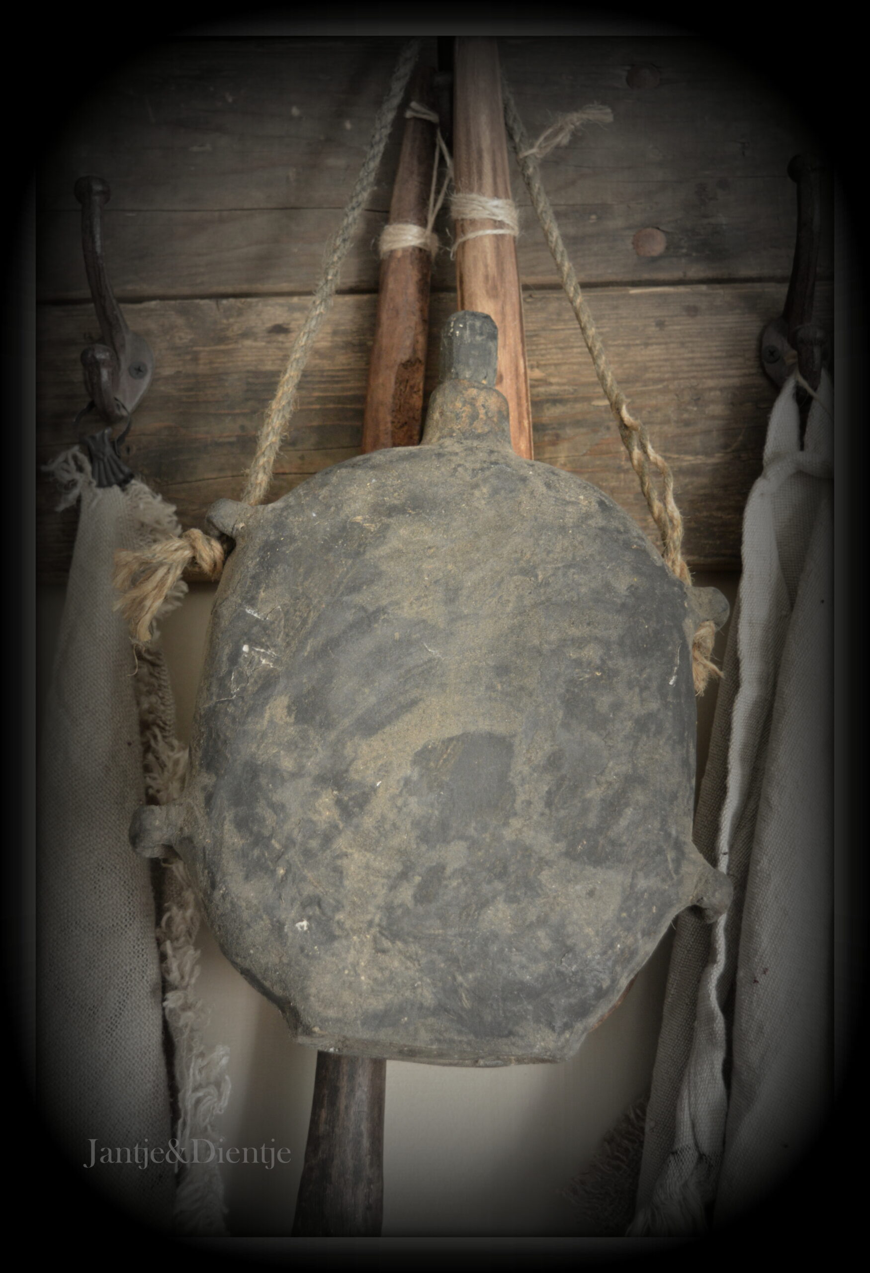 De kleine “oortjes” of lussen aan de zijkanten zijn essentieel. Hierdoor werd een touw of lederen riem gehaald, zoals ook op de foto te zien is, zodat de fles over de schouder gedragen kon worden.