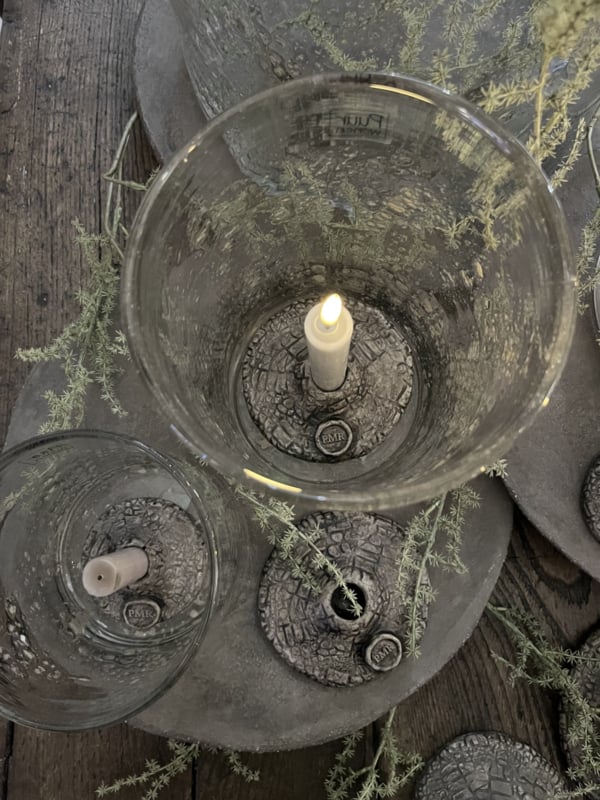Handgemaakt windlicht kandelaar van beton, met Croco print en logo.