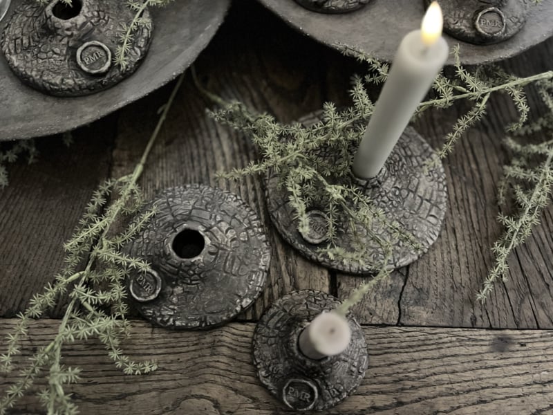 Handgemaakt windlicht kandelaar van beton, met Croco print en logo.